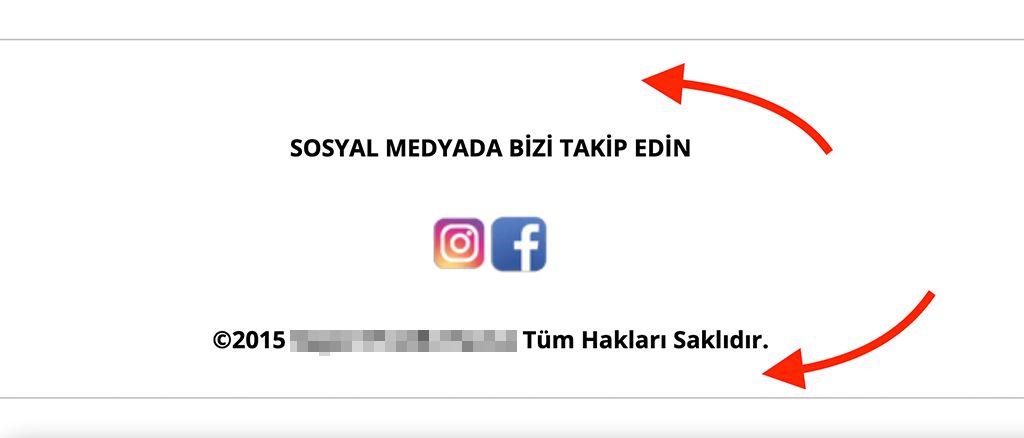 Web sitenin footer bölümünde (2. görsel) yukarıdaki ve aşağıdaki boşluklar eşit değil. Bu stil bazen web sitenin tasarımına bağlı olarak kullanılabilir (üstteki yazıyı başlık kabul ederek) ama burada durum farklı. Ayrıca Instagram ve Facebook ikonlarının çözünürlüğü o kadar düşük ki, ve birbirine o kadar yakın ki.