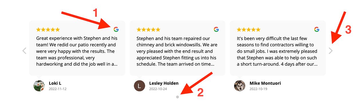 2- Sayfada üç değerlendirme gösteriliyor. Fakat buna rağmen Pagination Dots (Sayfalama Noktaları) dediğimiz noktadan bir tane kullanılmış. Bir tane kullanılma sebebi, sadece 3 yorum var, slaytın hareket etme durumu yok, çünkü başka yorum yok.