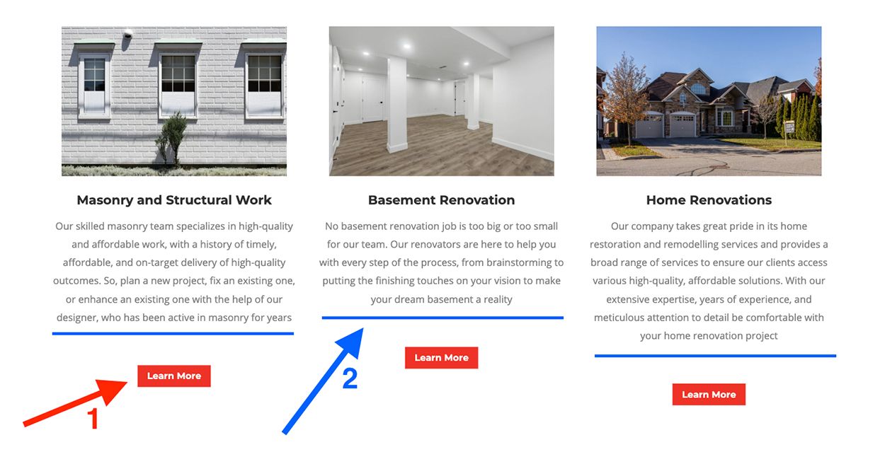 Eşit boyutlarda 3 görsel kullanılmış. Başlıklar da tek satırda toplanmış. Fakat açıklama yazılarının uzunluklarının farklı olması, aşağıdaki butonların farklı yerlerde konumlanmasına sebep olmuş.